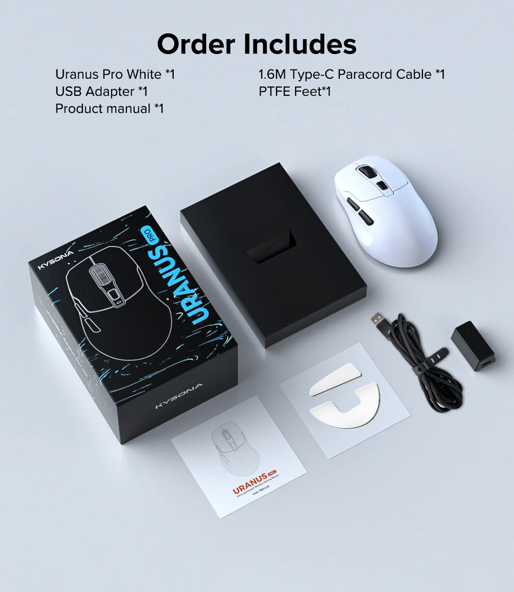 - Package list: Uranus pro mouse, 2.4m k high-speed transmission paracord cable, 8k large receiver, english product manual, gift box packaging
